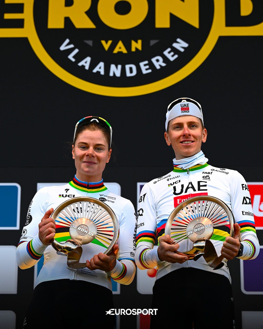 Aggiungete la doppia vittoria dei campioni del mondo in carica, il gioco è fatto e il risultato è pura magia. Assistere agli istanti immediatamente successivi all’ultimo attacco di Pogačar - quello definitivo, quello risolutivo - sul Kwaremont, essere presenti quando Lotte Kopecky passa sulle pietre con un boato di gente che urla collettivamente il suo nome fa davvero venire la pelle d’oca.